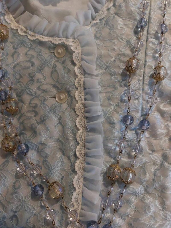De kralen zijn niet van glas, maar kunststof kralen in blauw en goud. Maar, daarom niet minder mooi. In prachtige kroontjes gezet. Af en toe zul je eens een oogje moeten dichtknijpen, maar dat maakt deze 75 cm lange ketting niet minder Vintage en zeer Waardevol