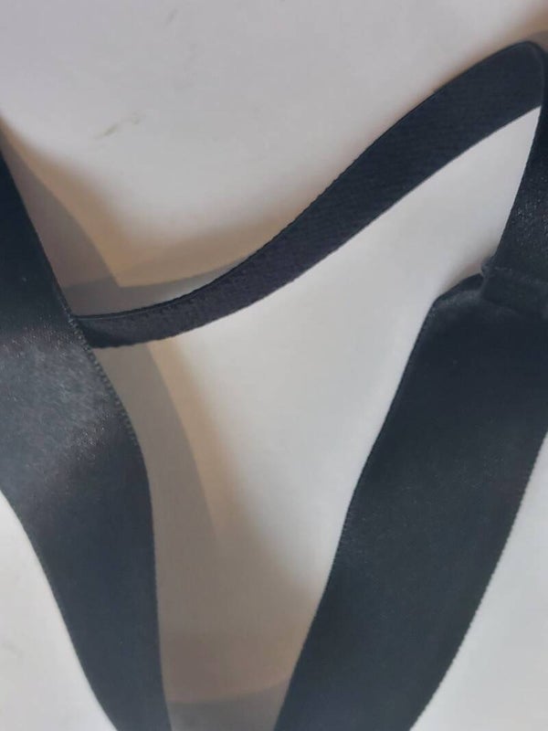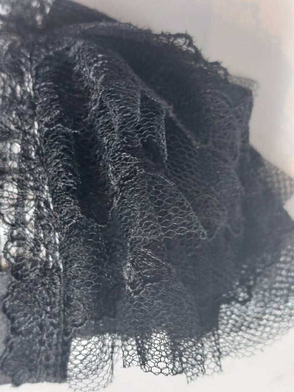Zwart wit ruitje met tussenstokje van zwarte kanten ruches, verleidelijke bandjes met knoopjes en striksluiting achter.