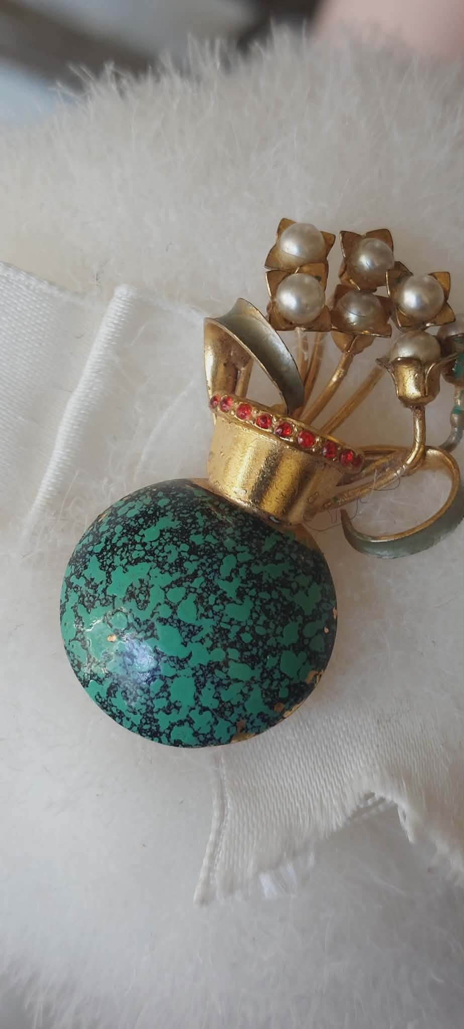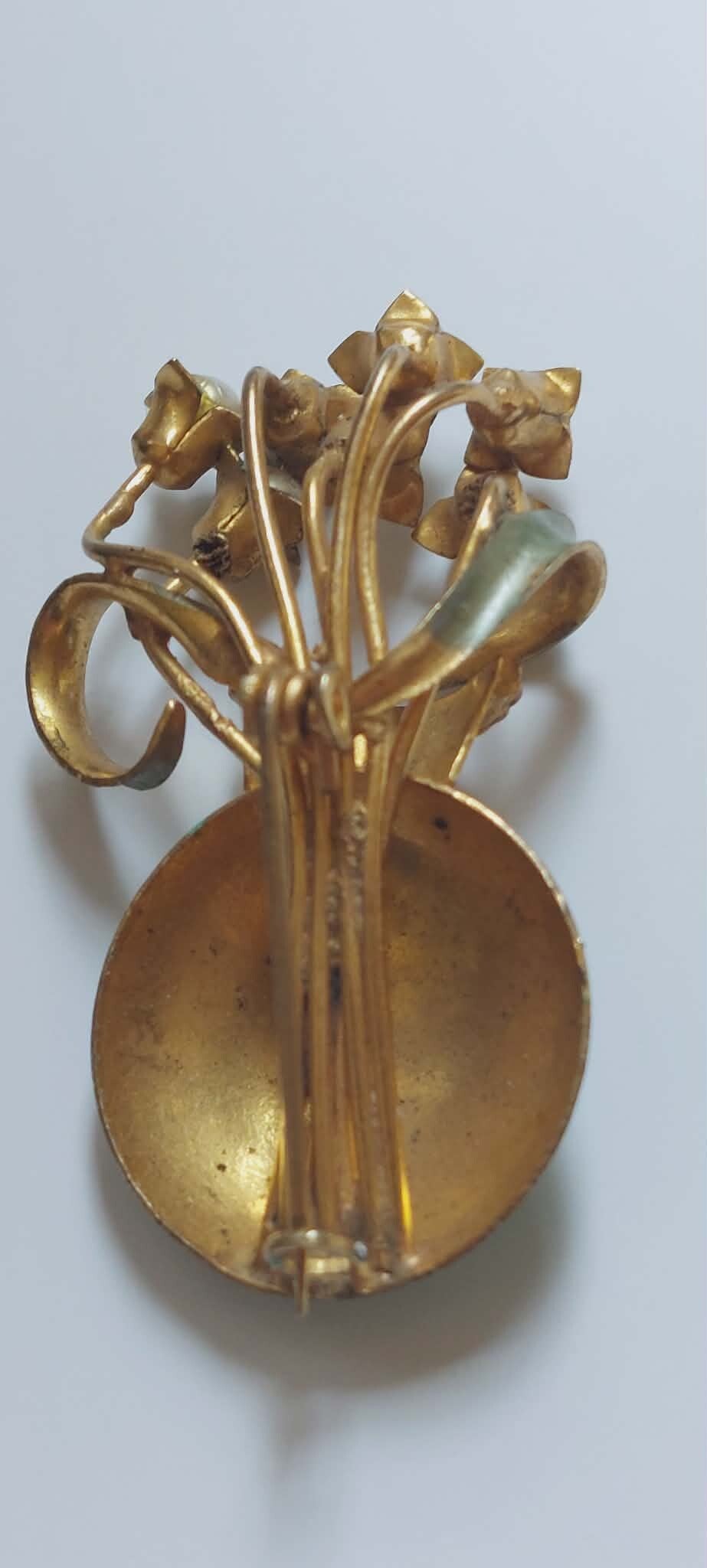 Een verfijnde vintage bloemenbroche uit de jaren ’50, met parelknoppen en een goudkleurig boeket. Een zacht, vrouwelijk object dat de elegantie van mid‑century costume jewelry draagt.