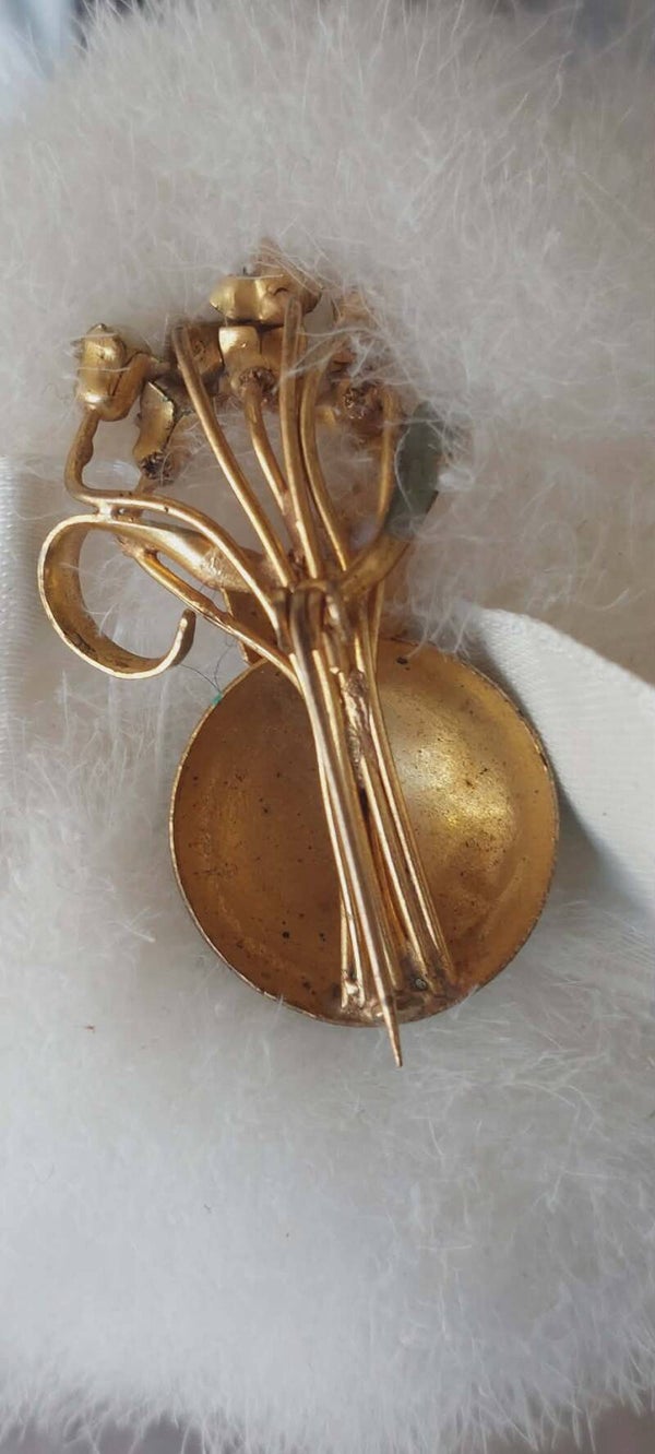 Deze delicate bloemenbroche uit ca. 1950 is een ode aan de vrouwelijke elegantie van het mid‑century tijdperk. De goudkleurige stelen waaieren uit als een klein boeket, elk bekroond met een parelachtige knop. Het is een sierlijk object dat gedragen werd op mantels, jurken en sjaals — een subtiel statement van verfijning.De broche is licht, sculpturaal en tijdloos. Een klein stukje erfgoed dat zacht genoeg is voor het boudoir, maar sterk genoeg om een outfit te dragen